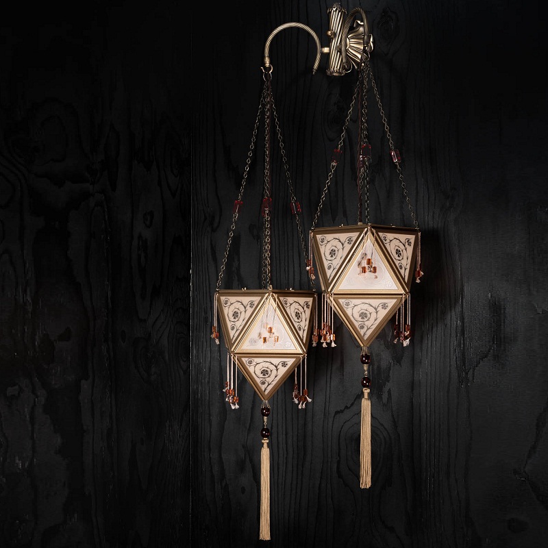 Бра с артикулом 601/2 APPLIQUE от фабрики Archeo Venice Design из коллекции 600. Бра сделано в восточном стиле: два подвесных граненых светильника крепятся к двум рожкам. Светильник расписан золотым узором.Вы можете купить светильник в нашем интернет-магазине DecoShop по лучше цене.