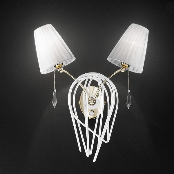 Бра IDL Flame 524/2A в современном стиле из Италии. Металлическое основание доступно в таких сочетаниях: белый матовый и светлое золото, белый матовый и никель матовый, медь и сталь. Абажур белый или коричневый, хрустальные подвески.