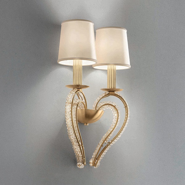 Бра Masiero Cristalis A2 в неоклассическом стиле из Италии. Металлическое основание в латунной отделке инкрустировано прозрачным хрусталем. Абажуры из сатина.