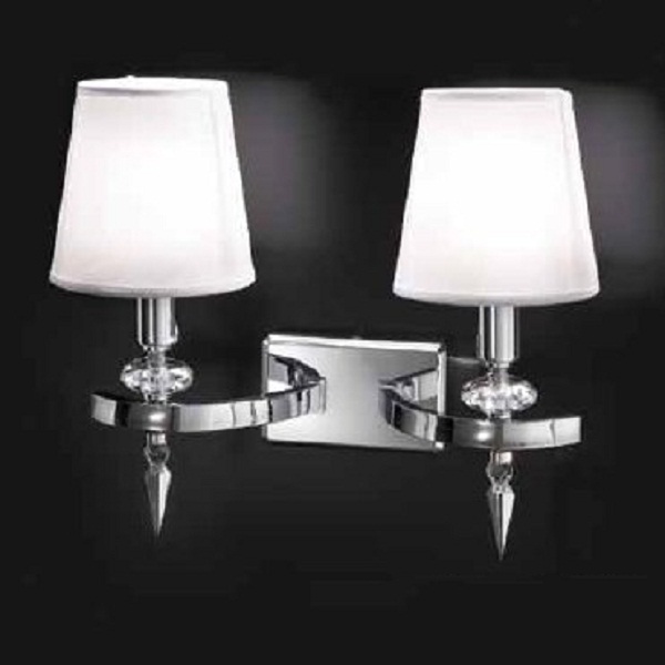 Весь светильник выполнен из латуни цвета полированного хрома; абажуры белого цвета. Также в светильнике есть хрустальные детали.