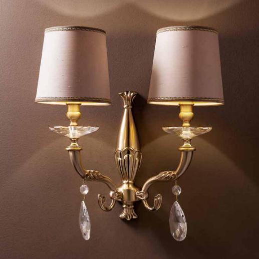 EGO - APPLIQUE 2 LUCI - FUSIONE DI OTTONE SATINATO/LUCIDO - PENDAGLI IN VETRO MOLATO - PARALUME