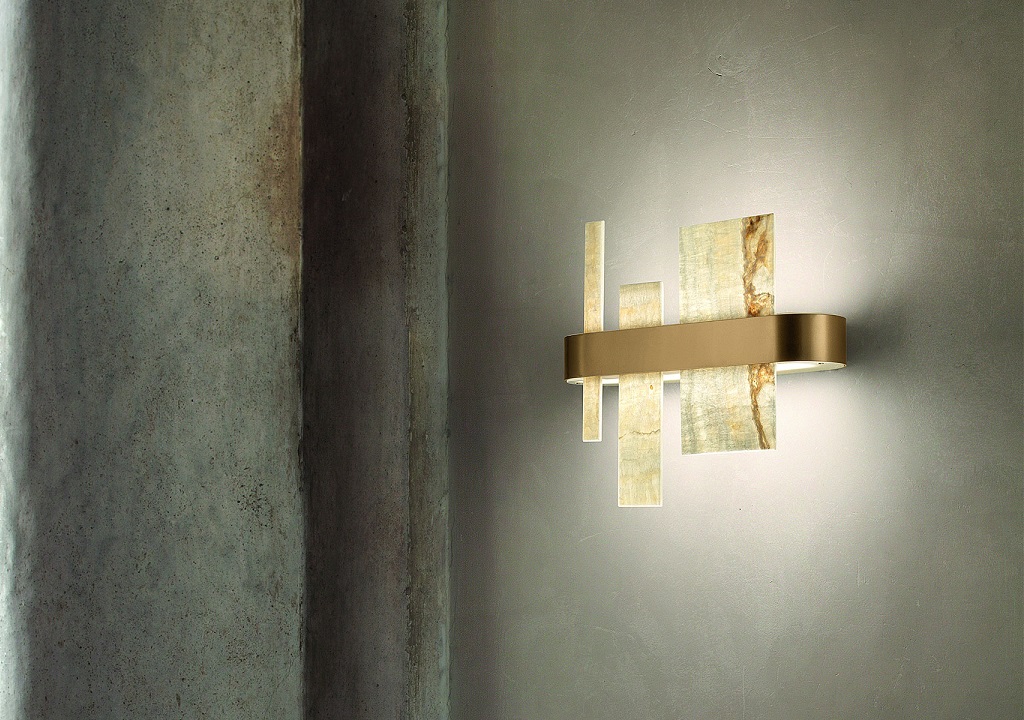 Бра Masiero Honice A37 в современном стиле из Италии. Металлическое основание доступно в 2-х отделках: матовое или полированное золото. Плафон из натурального оникса состоит из отдельных прямоугольных пластинок разного размера.