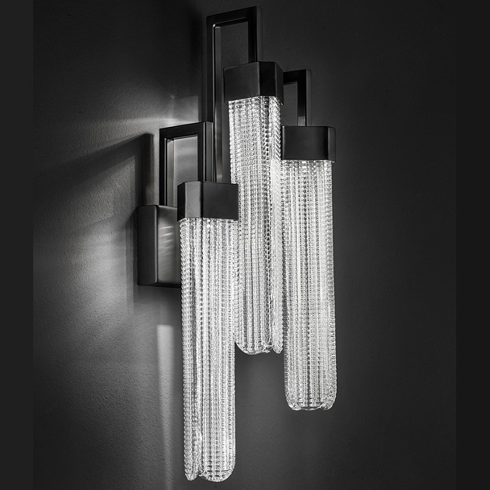 Настенный светильник Masiero Blake A3 в современном стиле из Италии. Чёрное металлическое основание и плафоны из прозрачного рельефного венецианского стекла.