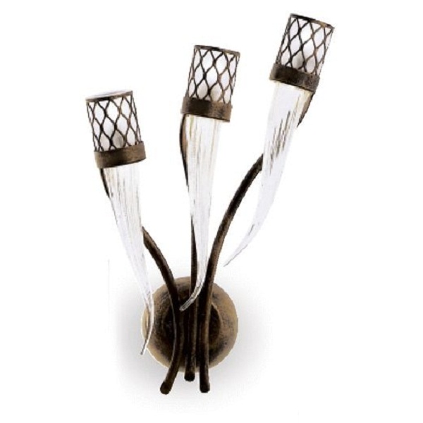 Весь светильник выполнен из латуни цвета атласной ржавчины; плафоны сделаны из Муранского стекла, которые напоминают белого цвета огонь в перевернутых чашах.