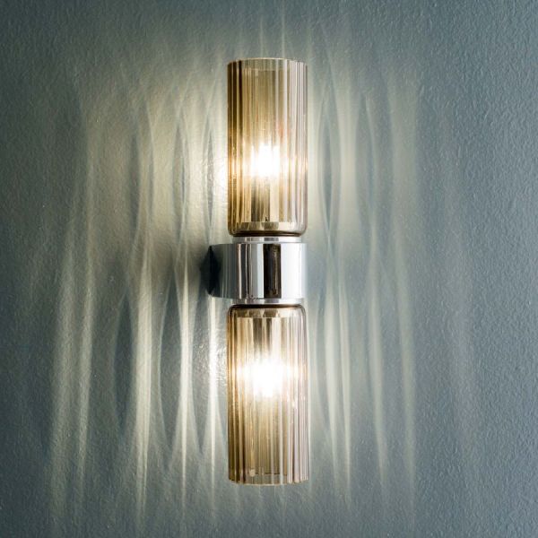 Крепление светильника - хромированное. Бра можно крепить как вертикально, так и горизонтально. Настенный светильник Korinthos из муранского стекла дымчатого цвета.