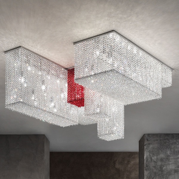 Потолочный светильник Masiero Cubo PL Combo 175 SQ в неоклассическом стиле из Италии. Металлическое основание хромового цвета. Хрустальные плафоны доступны в 7 вариантах отделки: дымчатый, зелёный, красный, прозрачный, синий, фиолетовый и янтарь.