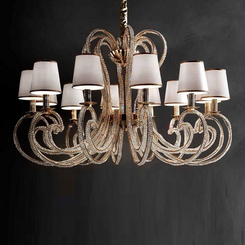 Люстра Masiero Cristalis 12 в неоклассическом стиле из Италии. Металлическое основание в латунной отделке инкрустировано прозрачным хрусталем. Абажуры из сатина.