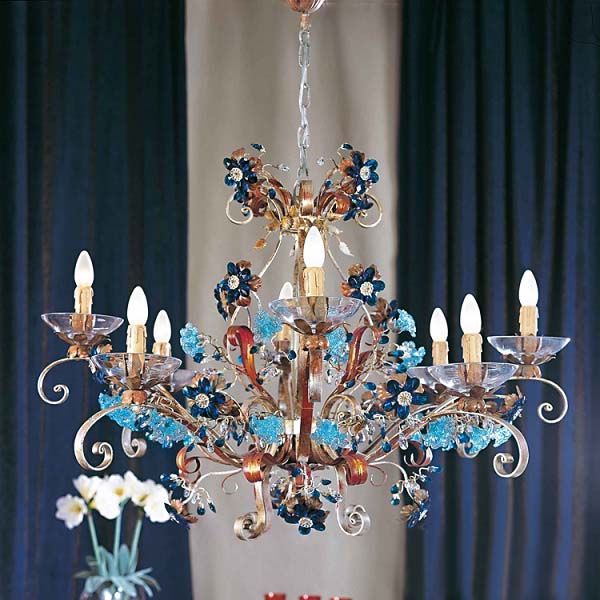 Люстра Mechini L264/8, испанского производителя Mechini. Коллекция светильников произведена из высококачественных материалов по европейским стандартам качества. Кованная люстра ручной работы украшена богемским хрусталем, декоративные элементы - муранское стекло. В светильнике этой серии используется патрон E14, а в качестве источника света - лампочка мощностью до 60W.
