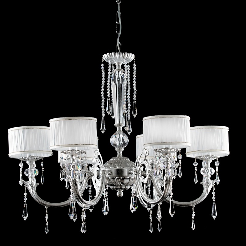 Классическая люстра Due Effe LA/6/ DEC. 04/ SW/ MGF15. Ажурные серебряные рожки поддерживают лампочки-свечи с подставками и белые, как будто помятые, абажуры с окантовкой. Люстра декорирована хрустальными подвесками. Вы можете купить светильник в нашем интернет-магазине DecoShop по лучшей цене.