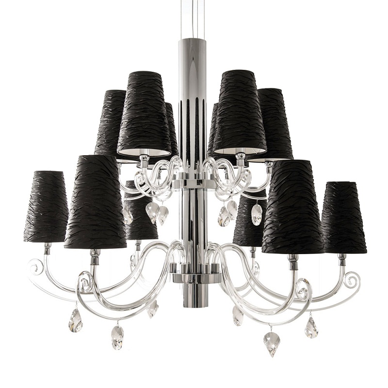 Люстра Ilfari Arabian Pearls H2+1 10131 в современном стиле. Цилиндрическое основание с прозрачными рожками дополнено черными матовыми абажурами и хрустальными подвесками. Вы можете купить светильник в нашем интернет-магазине DecoShop по лучшей цене.