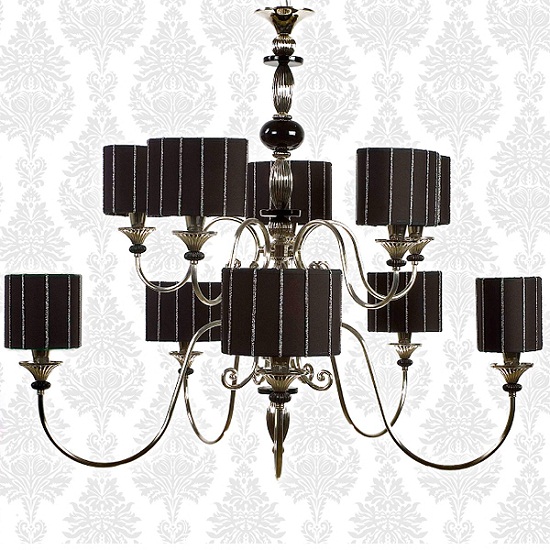 Современная люстра Jago NCS 07 с десятью абажурами черного цвета в серебристую полосочку и рожками цвета состаренного серебра. Вы можете купить светильник в нашем интернет-магазине DecoShop по лучшей цене.