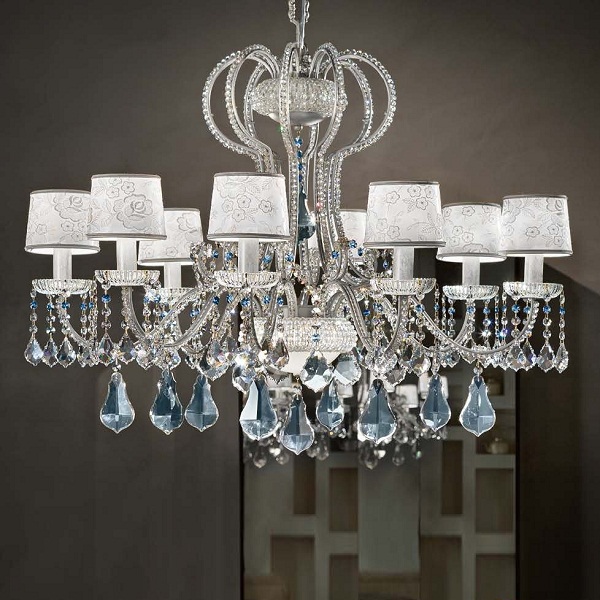 Люстра Masiero Gala 12+3+2 в неоклассическом стиле из Италии. Все предметы серии доступны к заказу в 2-х вариантах: абажур цвета слоновой кости и золотое основание или белый абажур и серебряное основание. Декоративные элементы из прозрачного хрусталя, абажуры – из атласа.