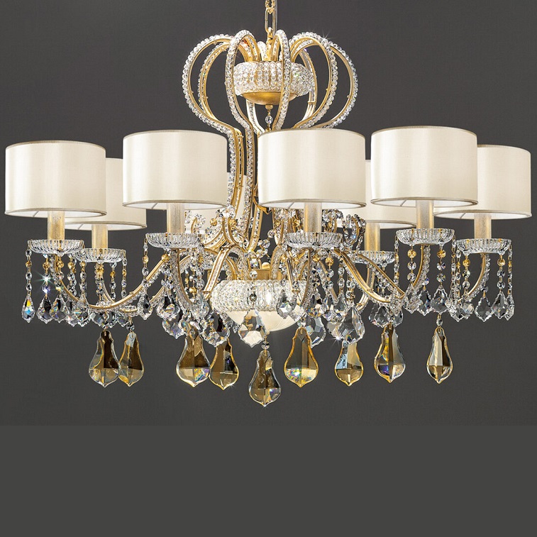 Люстра Masiero Gala 8+2 в неоклассическом стиле из Италии. Все предметы серии доступны к заказу в 2-х вариантах: абажур цвета слоновой кости и золотое основание или белый абажур и серебряное основание. Декоративные элементы из прозрачного хрусталя, абажуры – из атласа.