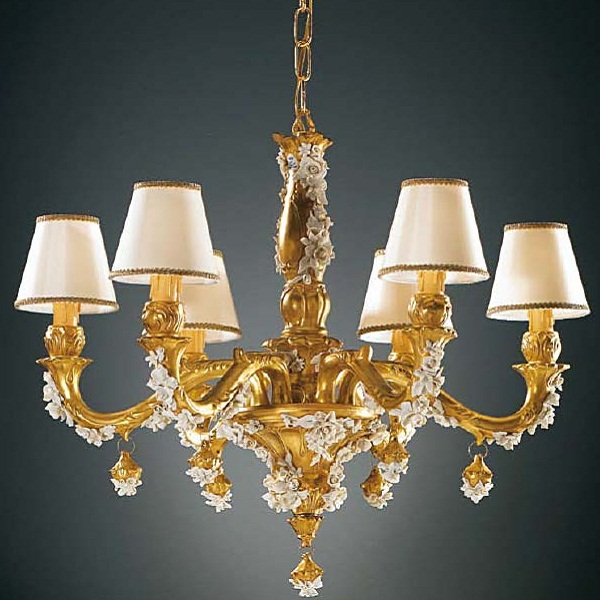 Люстра Villari Porcelain 003.9 во флористическом стиле. Золотая чаша выпускает рожки с лампочками-свечками, накрытыми абажурами с окантовкой. Вся конструкция украшена молочными цветами. Вы можете купить светильник в нашем интернет-магазине DecoShop по лучшей цене.