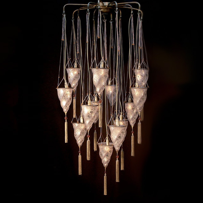 Люстра с артикулом 401.13 от фабрики Archeo Venice Design из коллекции 400. Люстра сделана в современно-восточном стиле: плафоны в виде обрезанных капель крепятся к припотолочным рожкам. Плафоны дополненыкисточками и золотыми узорами. Вы можете купить светильник в нашем интернет-магазине DecoShop по лучше цене.