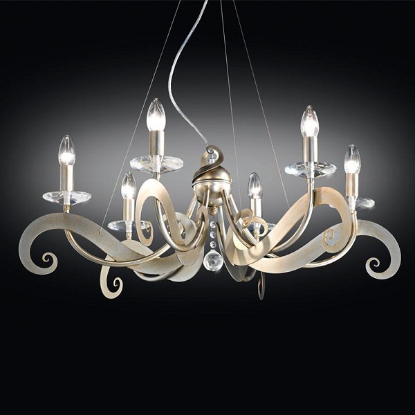 Люстра Contemporanea Sofia S в современном стиле. Плоские закрученные рожки из металла выходят из сферического основания и поддерживают хрустальные "блюдца" с лампочками-свечками. Вы можете купить светильник в нашем интернет-магазине DecoShop по лучшей цене.
