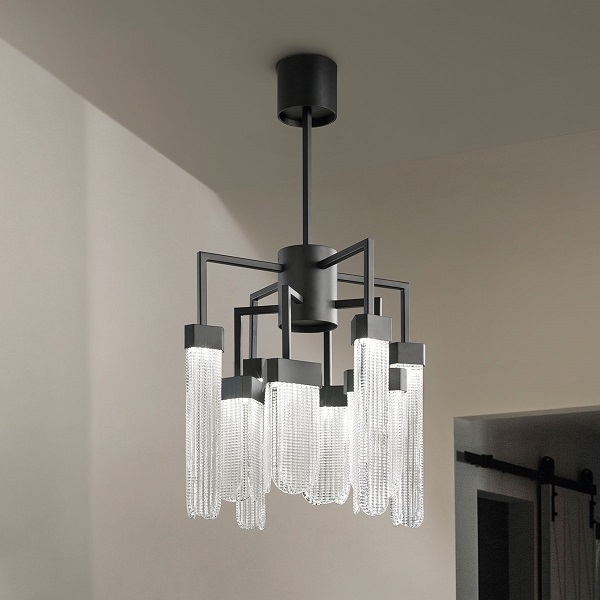 Люстра Masiero Blake S8 в современном стиле из Италии. Чёрное металлическое основание и плафоны из прозрачного рельефного венецианского стекла.