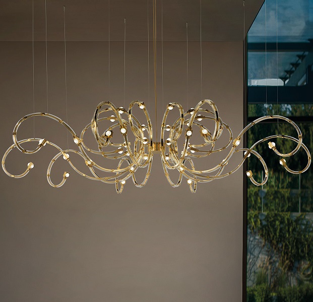 Люстра Masiero Raqam A из Италии. Металлический каркас, «заключенный» в стекло, доступен в разных модулях. Источник освещения – светодиоды, равномерно размещённые по всему светильнику.
