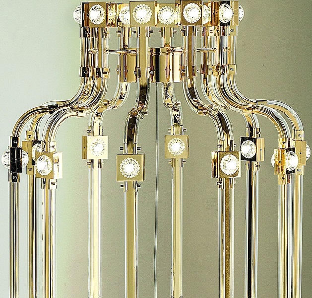 Люстра Masiero Raqam H из Италии. Металлический каркас, «заключенный» в стекло, доступен в разных модулях. Источник освещения – светодиоды, равномерно размещённые по всему светильнику.