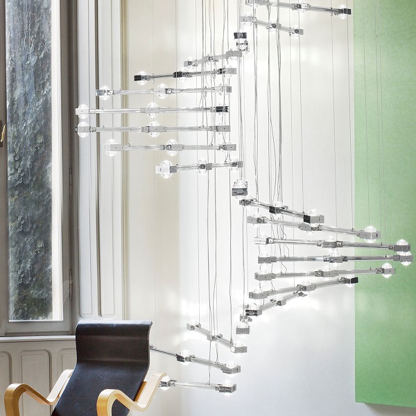 Люстра Masiero Raqam P4 из Италии. Металлический каркас, «заключенный» в стекло, доступен в разных модулях. Источник освещения – светодиоды, равномерно размещённые по всему светильнику.