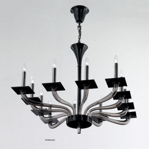 Люстра De Majo Tetra K12, итальянского производителя De Majo. Коллекция светильников произведена из высококачественных материалов по европейским стандартам качества. Люстра изготовлена веницианскими мастерами из благородного муранского стекла. Структура из хромированного металла черного цвета. В коллекции представлены люстры с 8, 12 и 16 лампами. В светильнике этой серии используется патрон E14, а в качестве источника света - лампочка мощностью 40W.