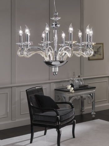 Люстра Renzo del Ventisette Contemporanea L 14301/10 в современном стиле из Италии. Красивые фигурные рожки выдуты вручную из муранского стекла. Хромированная декоративная чаша полусферической формы красиво отражает свет. Вы можете купить светильник в нашем интернет-магазине DecoShop по лучшей цене.