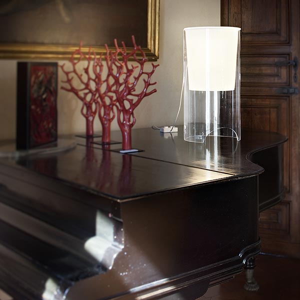 Настольная лампа Flos Aoy F0200071 в современном стиле из Италии. Настольная лампа, обеспечивающая рассеянный свет. Прозрачный стеклянный цилиндрический корпус лампы. Белый опаловый стеклянный рассеиватель и отражатель.