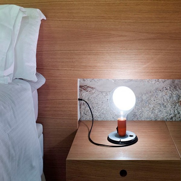 Настольная лампа Flos Lampadina F3300075 в современном стиле из Италии. Настольная лампа, обеспечивающая прямой, рассеянный свет. Анодированная алюминиевая основа служит для того, чтобы держать лишний шнур питания. Бакелитовый светильник, окрашенный вместе с переключателем оранжевого и черного цветов. Прозрачная круглая лампа частично пескоструйная для рассеивания света.