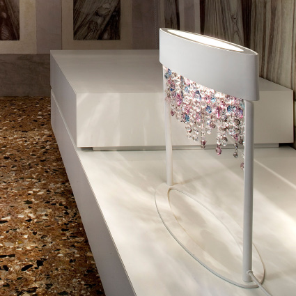 Настольная лампа Masiero OLA TL2 в современном стиле из Италии. Основание из окрашенного металла доступно в 9 отделках: белый, бронза, золото, красный, латунь, медь, серебро, синий, чёрный. Подвески из разноцветного стекла.