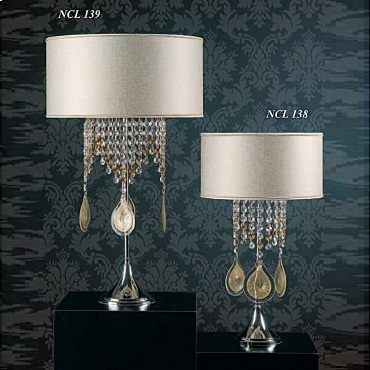 Настольная лампа Jago NCL 139, итальянского производителя Jago. Коллекция светильников произведена из высококачественных материалов по европейским стандартам качества. Настльная лампа с абажуром, муранским стеклом и итальянским хрусталем. Отделка металла - никель. Хрусталь - итальянский. Подвески - муранское стекло. Декор - золотой лист. В светильнике этой серии используется патрон E27, а в качестве источника света - лампочка мощностью 60W.