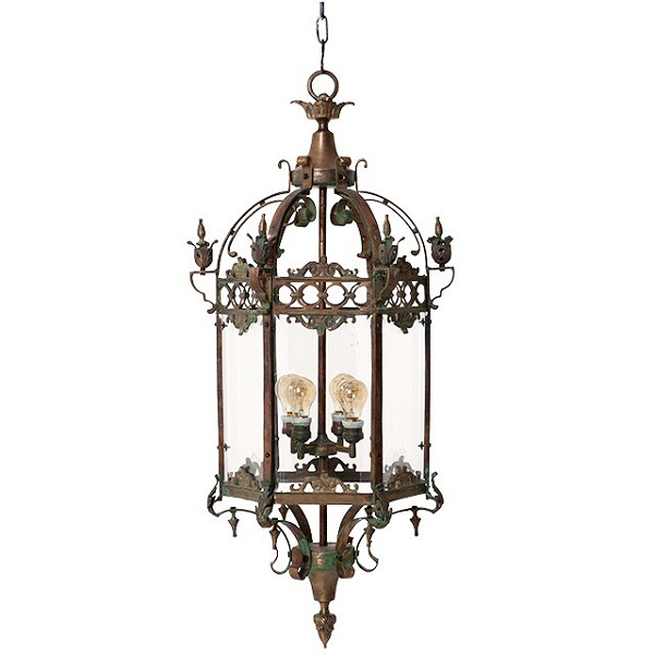 Светильник выполнен из латуни античного стиля и прозрачного стекла.