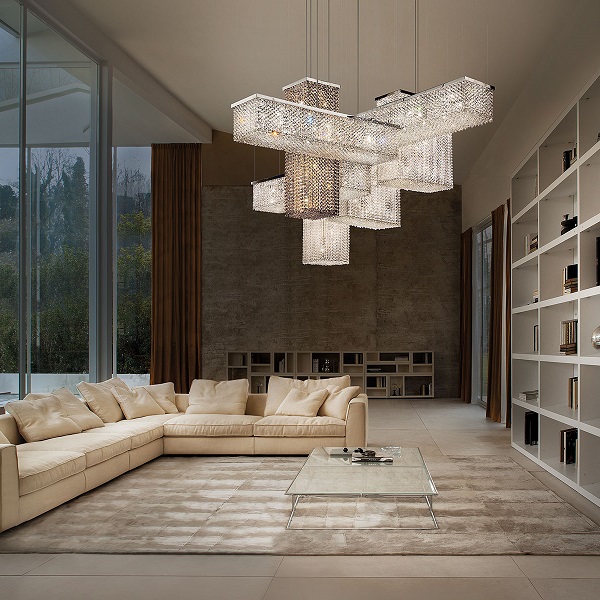 Подвесной светильник Masiero Cubo S Combo 175 SQ в неоклассическом стиле из Италии. Металлическое основание хромового цвета. Хрустальные плафоны доступны в 7 вариантах отделки: дымчатый, зелёный, красный, прозрачный, синий, фиолетовый и янтарь.