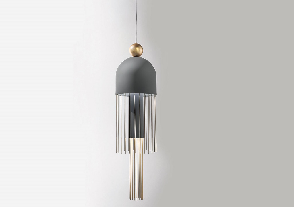 Подвесной светильник Masiero NAPPE XL2 в современном стиле из Италии. Основание из окрашенного метала золотого цвета дополнено подвесками из Pirex.