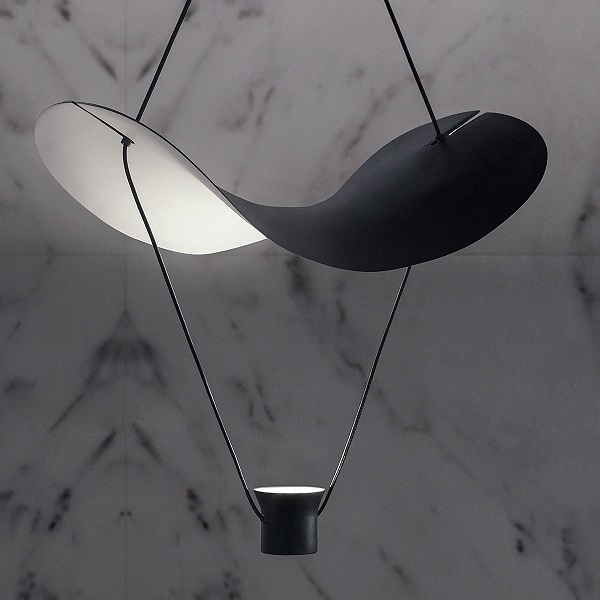 Подвесной светильник Masiero Vollee S1G в современном стиле из Италии. Форма светильника напоминает футуристичный летательный аппарат. Основание из окрашенного металла доступно в 5 цветах: белый, матовое золото, оранжевый, синий и чёрный.