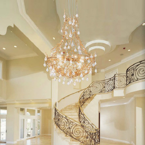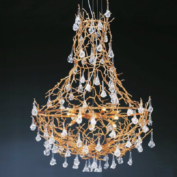 Весь светильник выполнен из маталла цвета теплого золота, который дополняется подвесками из прозрачного стекла. Благодаря такой конструкции, он напоминает коралловый риф с каплями кристальной воды.