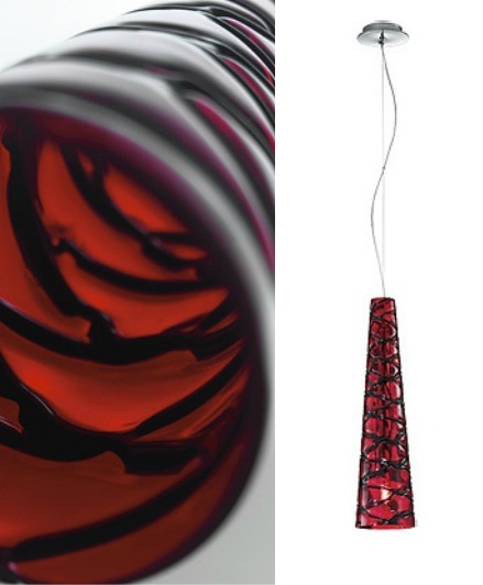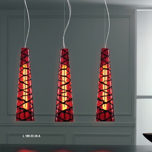 Подвес Lucerni L10923, серия Rombo, итальянского производителя Lucerni. Коллекция светильников произведена из высококачественных материалов по европейским стандартам качества. Подвесной светильник из металла и дутого стекла с рельефным рисунком из черных стекляных нитей, уложенных в горячем состоянии, ручная работа. Отделка основания - полированный хром. Цвет стекла - красный с черными нитями. В светильнике этой серии используется патрон 2G11, а в качестве источника света - лампочка мощностью 24W.