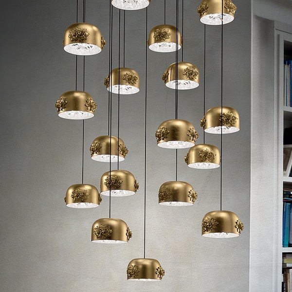Подвесной светильник Masiero Dame S18 в современном стиле из Италии. Алюминиевый плафон с хрустальными вставками-цветочками доступен в золотой или белой отделке.