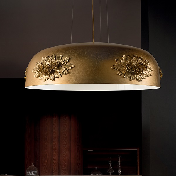 Подвесной светильник Masiero Dame S80 в современном стиле из Италии. Алюминиевый плафон с хрустальными вставками-цветочками доступен в золотой или белой отделке.