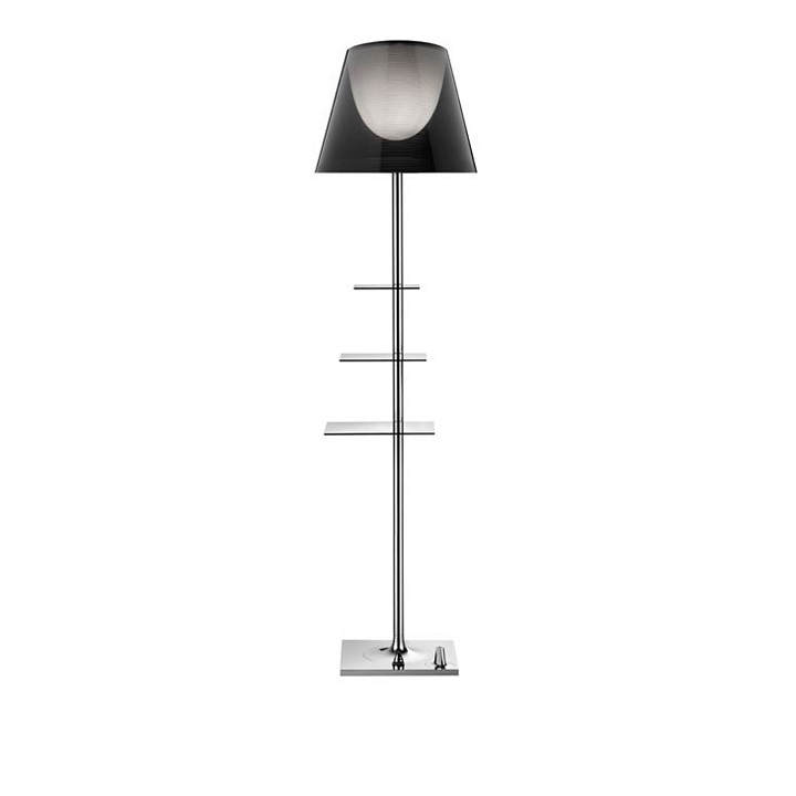 Торшер Flos Bibliotheque Nationale F1011030 в современном стиле из Италии. Напольный светильник с рассеянным светом. Основание, подставка для штанги и подставка для диффузора из хромированного цинка. База из оцинкованного стального листа P04. Внутренний диффузор и держатель лампы в корпусе с опаловым рисунком. Внешние диффузоры доступны в подходящей ткани из ПВХ, метакрилата с штампом, с прозрачной или дымчатой серой отделкой или из серебра или бронзы на внутренней поверхности, путем вакуумного алюминиевого покрытия. Верхнее кольцо с прозрачным инъекционным штампованным ПК. Кронштейны из полированной нержавеющей стали. Разъем USB, размещенный на базе, позволяет перезаряжать наиболее распространенные смартфоны и планшеты (макс. 2A).