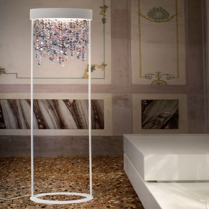 Торшер Masiero OLA STL2 в современном стиле из Италии. Основание из окрашенного металла доступно в 9 отделках: белый, бронза, золото, красный, латунь, медь, серебро, синий, чёрный. Подвески из разноцветного стекла.
