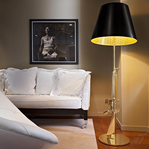 Торшер Flos Lounge Gun F2955000 в современном стиле из Италии. Напольный светильник, обеспечивающий прямое считывание и окружающее освещение. Корпус представляет собой литой алюминий с нанесенным полимерным покрытием и глянцевым покрытием 18K или хромированной отделкой. Матовая черная пластифицированная бумага с внутренним золотым шелкографическим или белым цветом с внутренним серебристым шелкографическим покрытием. На кабеле имеется электронный диммер, который позволяет регулировать яркость света.