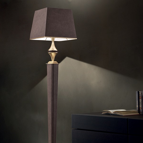 Торшер Masiero Darshan STL в современном стиле из Италии. Деревянное основание и абажуры из экокожи доступны в белом и коричневом цветах. Металлические вставки латунного или хромовго цвета гармонично завершают образ.