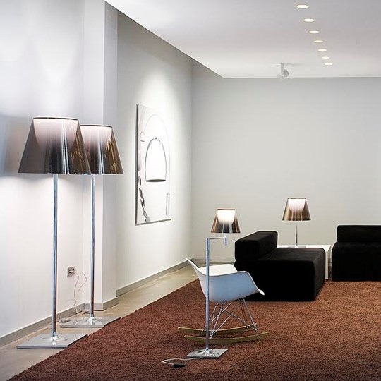 Торшер Flos KTribe F6265046 в современном стиле из Италии. Напольный светильник, обеспечивающий рассеянное освещение; переключатель, расположенный рядом с диффузором, позволяет регулировать 4 уровня освещенности через «дистанционный диммер», расположенный на шнуре питания рядом с пробкой. Базовая и стержневая опора в литом, полированном и хромированном сплаве Замак. , кронштейн из плексигласа и диффузора в полированной алюминиевой трубке. Литой стальной противовес с оцинкованной отделкой. Опаловый цвет внутреннего диффузора с инжекционным формованием PC (поликарбонат). Наружные диффузоры в прозрачном или фумие PMMA (полиметилметакрилат) и серебро или бронза на внутренней поверхности, с помощью вакуума алюминиевое покрытие. Верхнее кольцо с литьевым формованием PC (поликарбонат), полностью прозрачное или прозрачное коричневое для внешнего бронзового диффузора.